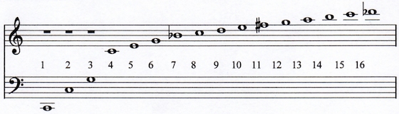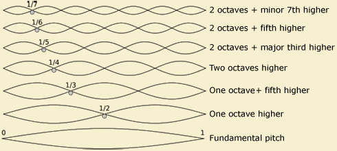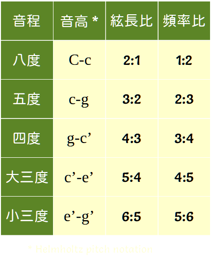 音程的數學比例 用手撥動每條絃的下段,聽聽看每兩條形成的音程。這六條絃由左至右每兩條的絃長分別有 2:1、3:2、4:3、5:4 與 6:5 的比例關係,形成八度、五度、四度、大三度與小三度的音程,頻率上分別有 1:2、2:3、3:4、4:5 與 5:6 的比例關係。 泛音列